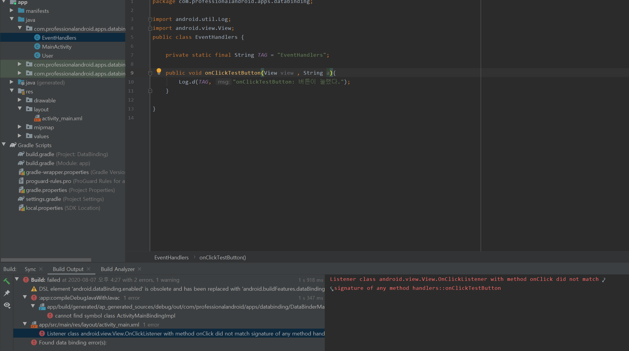 만약 onClickTestButton(View view , String str)로 시그니처를 안 맞춘다면, 컴파일 시 다음과 같은 에러가 난다.