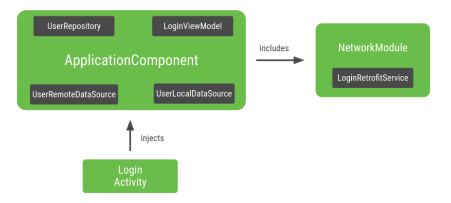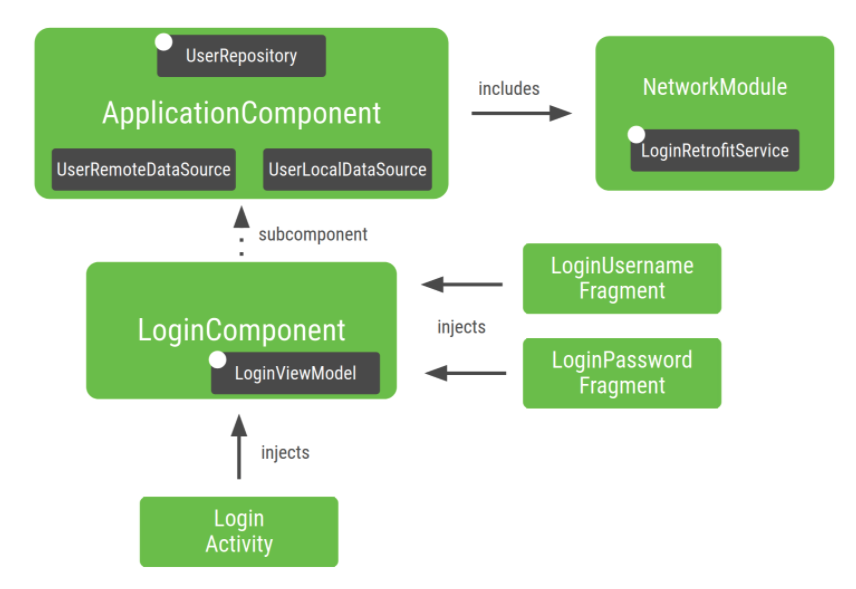 예를 들어, LoginUsernameFragment 및 LoginPasswordFragment가있는 경우 LoginComponent에 의해 주입된다.
