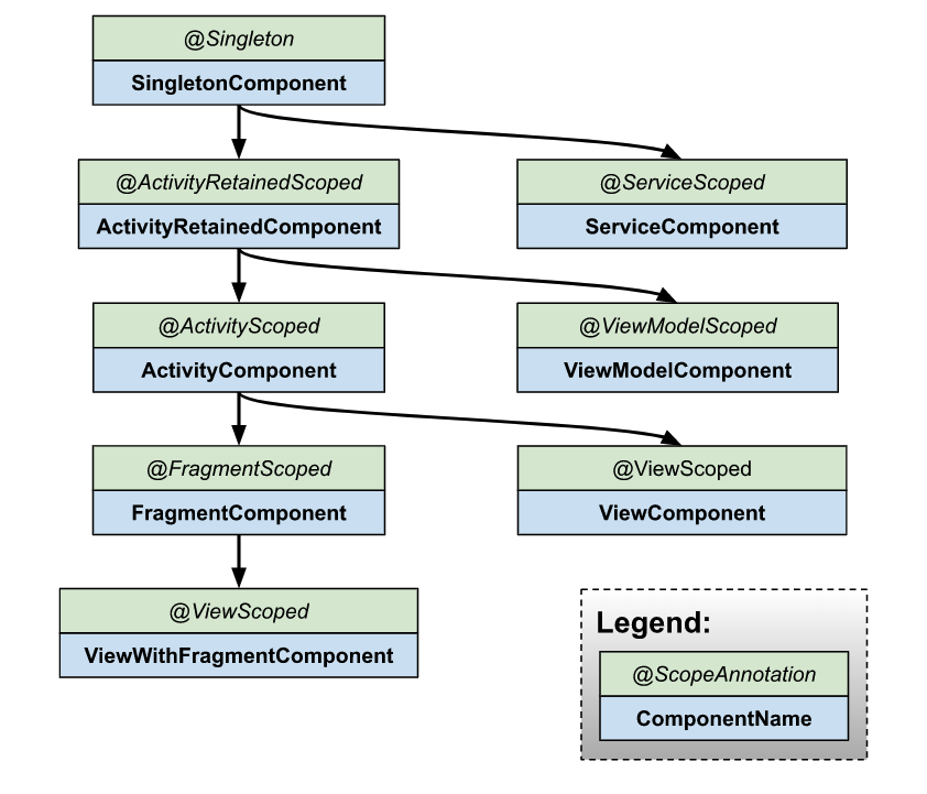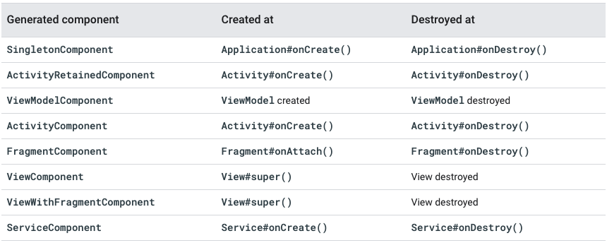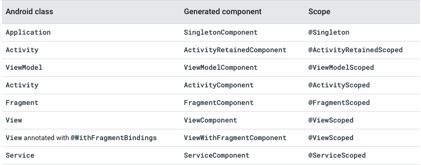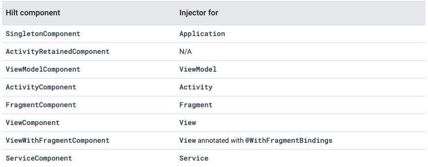 필드 삽입을 할 수있는 각 Android 클래스에 대해 @InstallIn 주석에서 참조 할 수있는 관련 Hilt component가 있습니다.