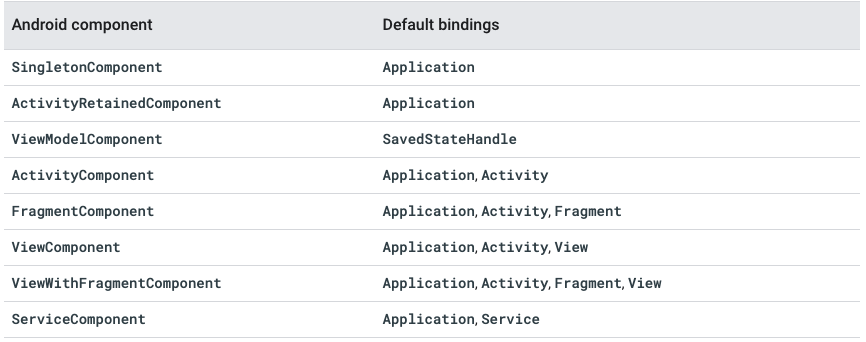또 다른 Hilt 사전에 정의된 바인딩을 확인하기 --> Component default bindings.