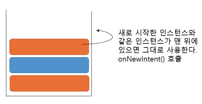 단, 해당 객체가 있는 Task 스택 상단에 이미 해당 액티비티의 기존 인스턴스가 있는 경우, 해당 인스턴스가 새 인텐트를 수신하게 된다,