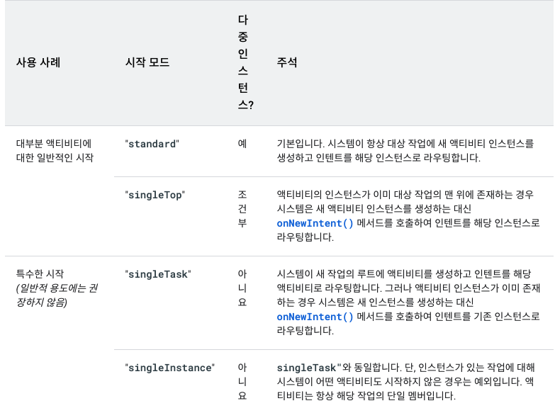 - Intent 를 처리하기 위해 Activity 호출할 때 발생하는 것을 결정하기 위해 Intent 객체에서 액티비티 플래그(FLAG_ACTIVITY_* 상수)와 함께 작동하는 4개의 모드가 있다.