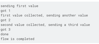 flow이 네트워크 요청과 같은 값 비싼 작업을 수행 한 경우 중요합니다. 또한 take (2) 연산자를 적용 했으므로 flow은 두 개의 값만 생성합니다. 두 번째 방출 호출 후 흐름 람다를 다시 재개하지 않으므로 "second value collect ..."줄은 인쇄되지 않습니다.