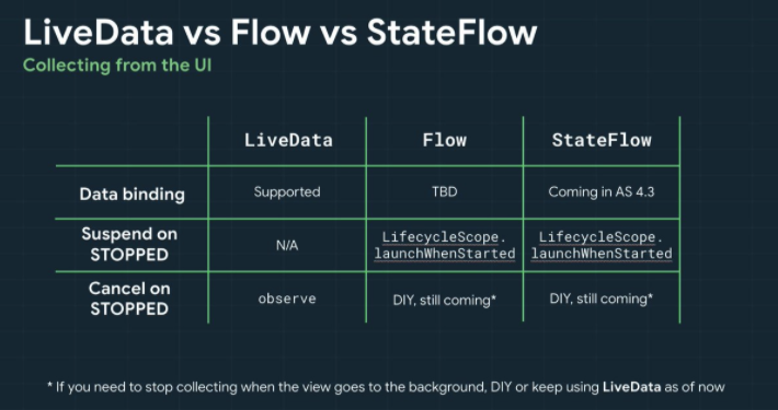 - View(Activity,Fragment)가 STOPPED 상태(백그라운드로 진입)가 되면 LiveData.observe()는 소비자를 자동으로 등록 취소하는 반면, StateFlow 또는 다른 flow에서 수집의 경우 자동으로 중지하지 않습니다.