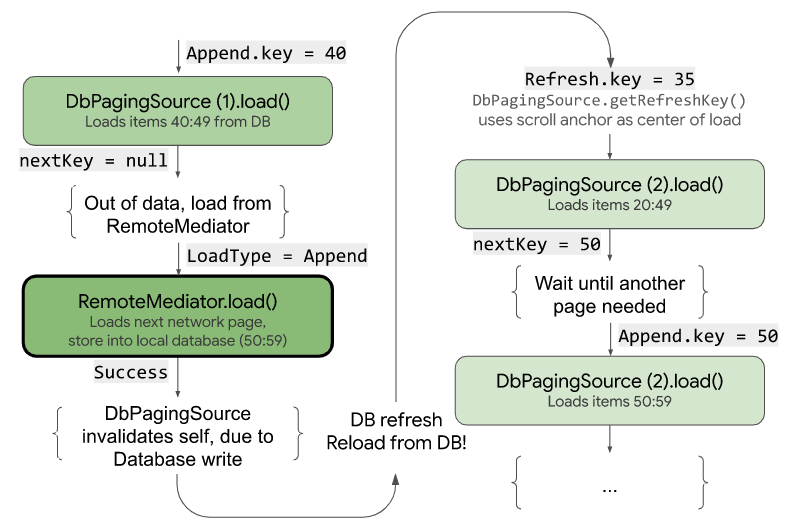 앱이 네트워크에서 로컬 데이터베이스로 incremental loading 를 지원해야 하는 경우에는 사용자의 스크롤 위치인 anchor 부터 페이지 나누기를 재개하는 기능을 지원해야 합니다.