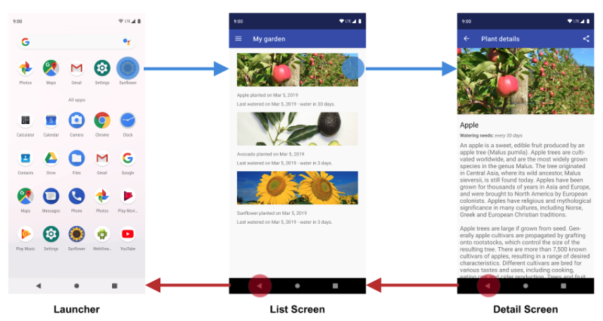 앱이 처음 실행되면 사용자를 위한 앱에 시작 화면이 표시됩니다. 첫 화면은 back stack의 기본 화면이 되며 앱의 navigation state에 대한 기초가 됩니다. stack 맨 위는 현재 화면이고 스택의 이전 화면은 사용자가 있었던 곳의 기록을 나타냅니다. back stack의 항상 맨 아래에 앱의 시작 화면이 있습니다.