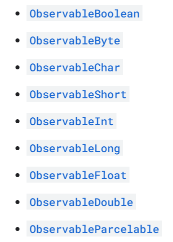 데이터 바인딩 라이브러리에서는 이미 Observable인터페이스를 구현한 몇몇 클래스를 제공하기 때문에 적합한 클래스를 찾을 수 있다면 직접 구현할 필요는 없다. 제공되는 클래스는 아래와 같다.