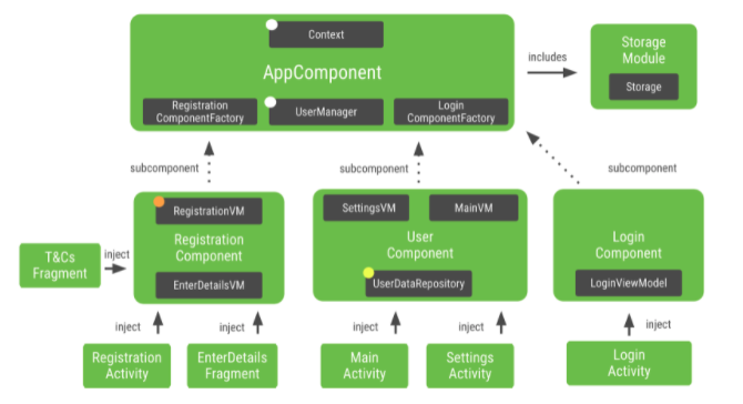 LoginComponent 및 RegistrationComponent는 각각의 Activity의 수명에 연결 되지만, UserComponent는 둘 이상의Activity을 주입할 수 있으며 Activity의 수가 앞으로도 증가할 수 있다.
