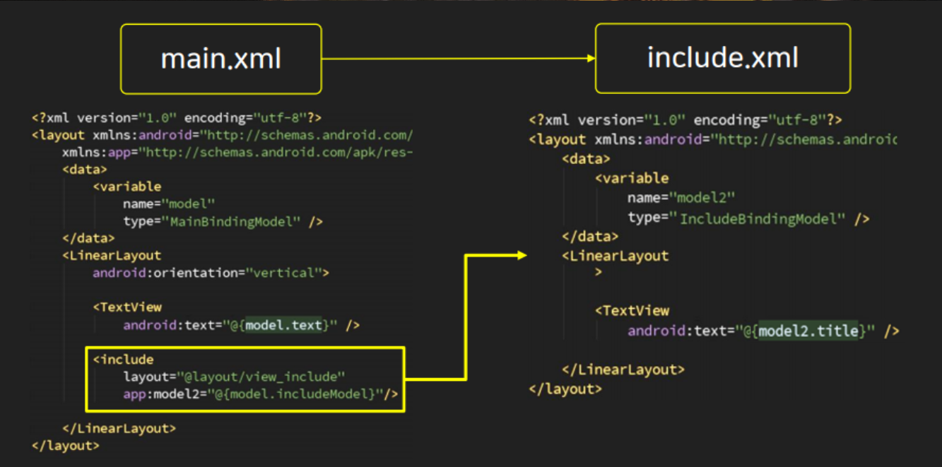 - 각 분할된 레이아웃 파일에 대해 바인딩되는 viewModel은 최상위에 바인딩된 뷰모델안에 참조를 둔다.
