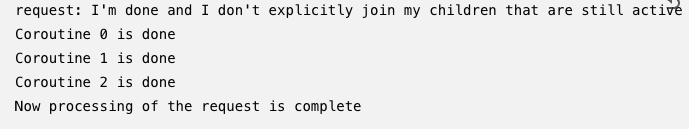 println("request: I'm done and I don't explicitly join my children that are still active")