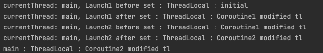 println("currentThread: ${Thread.currentThread().name}, Launch2 after set : ThreadLocal : ${tl.get()} ")