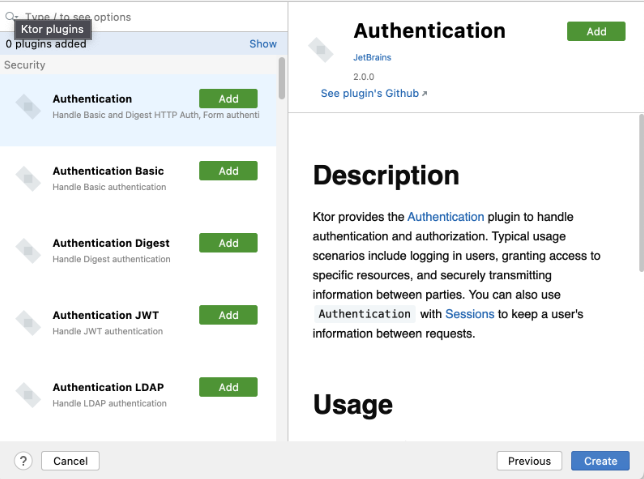 authentication, serialization and content encoding, compression, cookie support등과 같은 Ktor 애플리케이션의 공통 기능을 제공하는 빌딩 블록인 플러그인 세트를 선택.