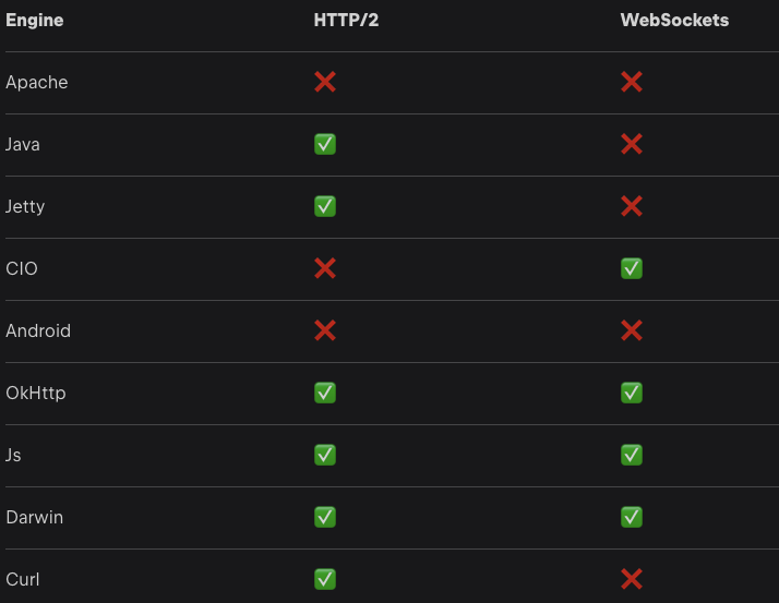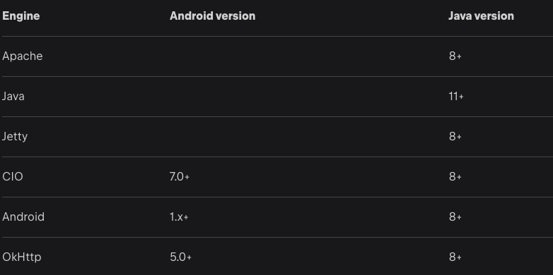 모든 엔진은 HttpClientEngineConfig에 의해 노출되는 몇 가지 공통 속성을 공유합니다.
