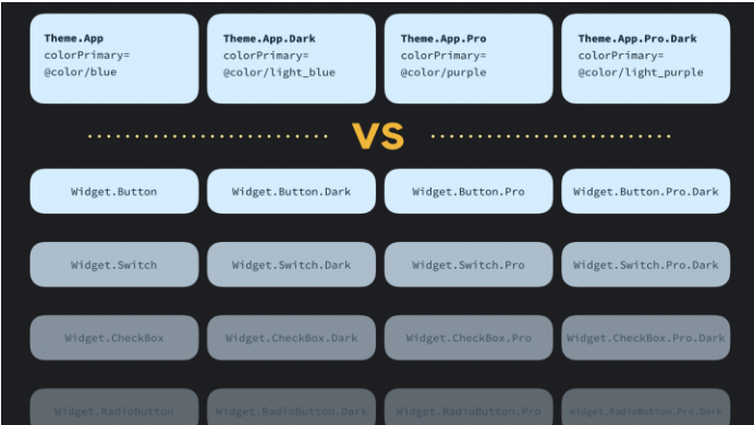 Style은 View 유형(버튼, 스위치 등)에 따라 다르므로 앱의 각 View 유형에 대해 (Widget.Pro.Light, Widget.Pro.Dark, Widget.NonPro.Light, Widget.NonPro.Dark)을 만들어야 합니다.