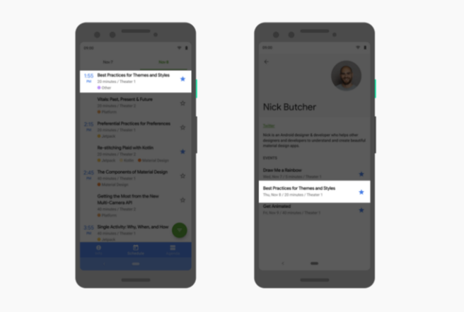 걱정하지 마세요... 직접 만드세요! 다음은 두 화면에 회의 세션 목록을 표시하는 Google I/O 앱의 예입니다.