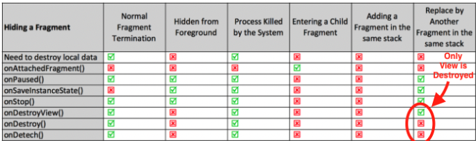 그러나 Fragment이 다른 Fragment으로 교체되는 경우(Fragment 트랜잭션 명령어 replace)(참고: Fragment 트랜잭션 명령어 add가 아니라.) 스택 아래 Fragment은 여전히 존재하지만 뷰는 파괴됩니다!