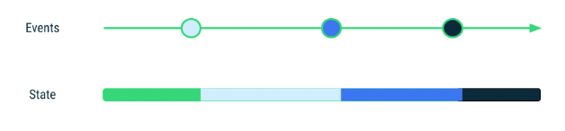 상태는 존재하고 이벤트는 발생한다는 것입니다. 아래의 다이어그램은 타임라인에서 이벤트가 발생할 때 상태 변경을 시각화하여 보여줍니다. 각 이벤트는 적절한 상태 홀더에 의해 처리되고 따라서 상태가 변경됩니다.