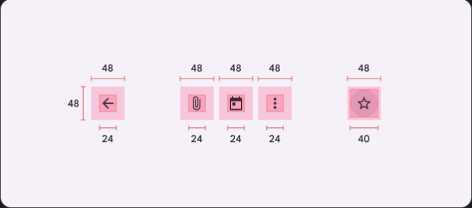 예를 들어 아이콘이 24 x 24dp로 표시될 수 있지만 아이콘을 둘러싼 패딩은 전체 48 x 48dp 터치 대상으로 구성됩니다.