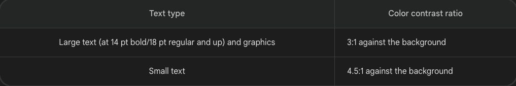W3C(World Wide Web Consortium)에 따르면 색상과 배경 사이의 명암비는 휘도(방출되는 빛의 강도)를 기준으로 1~21입니다.