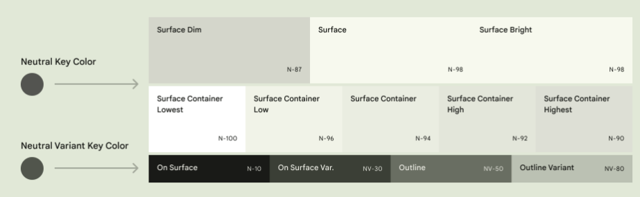 neutral key 색상은 배경에 대한 surface 색상 역할과 강조 텍스트 및 아이콘에 사용되는 색상을 도출하는 데 사용됩니다.
