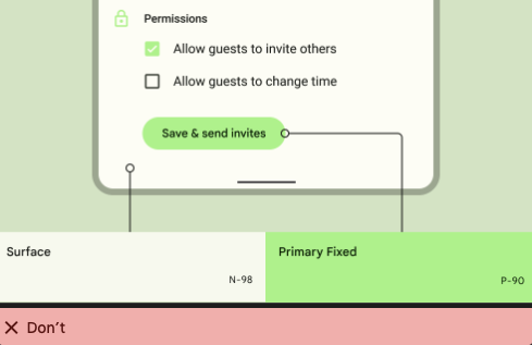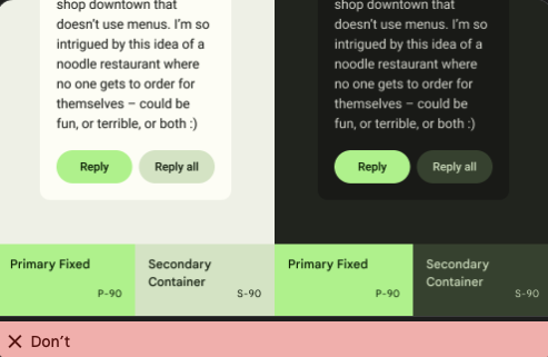 Fixed 색상은 밝은 테마와 어두운 테마에서 동일하게 유지되기 때문에 테마가 변경되면 화면의 다른 색상 사이에서 강조되는 색상이 변경될 수 있습니다. 계층적 버튼 그룹 내에서와 같이 이러한 색상 관계가 중요한 상황에서는 적용하지 마십시오.