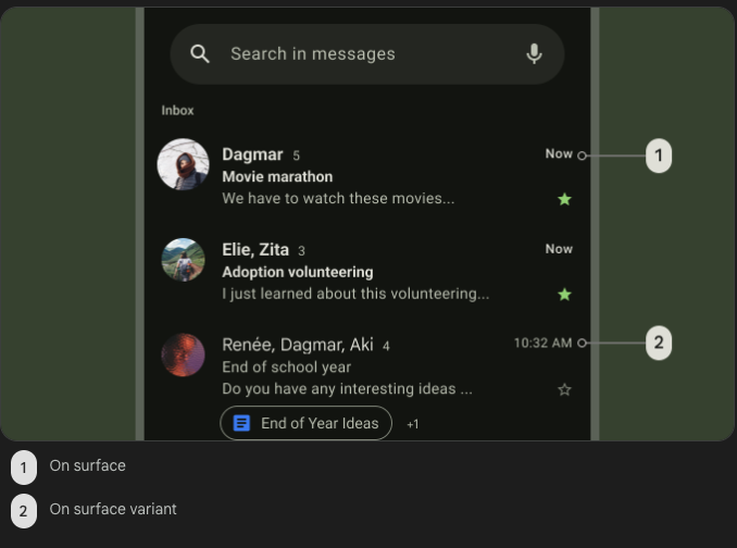 surface은 default "on" 색상 roles이며 surface Varient은 여전히 constrast 요구 사항을 충족하면서 낮은 강조 대안적 색상입니다.