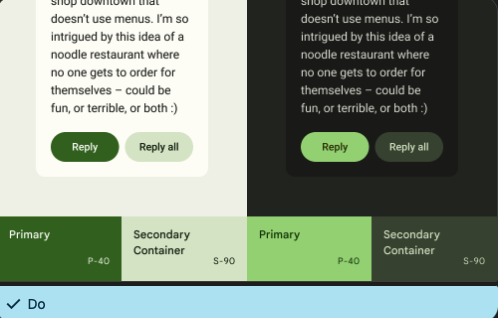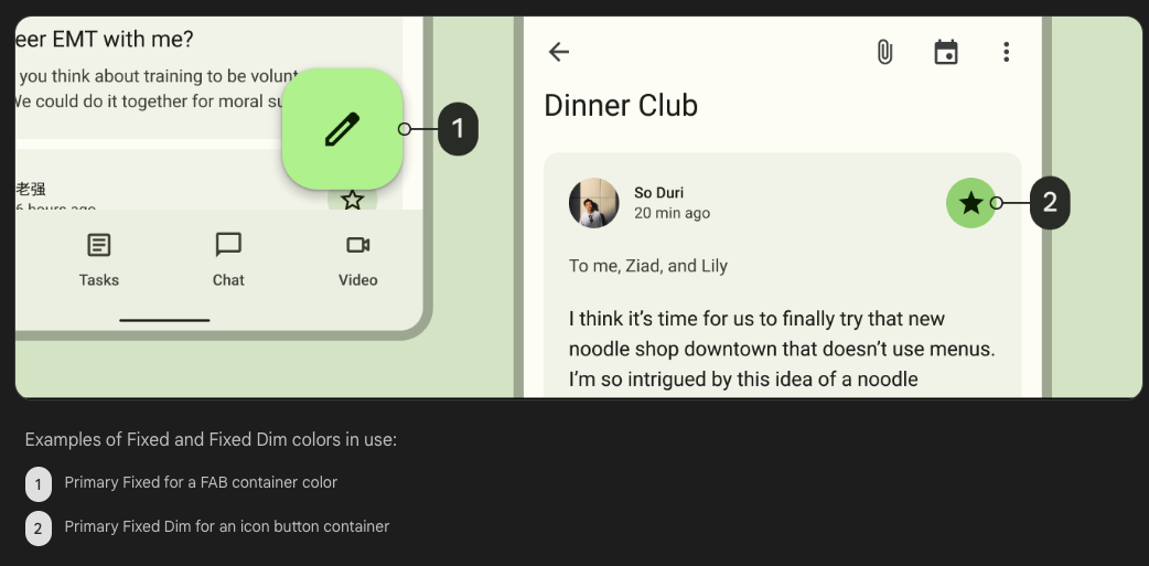 primary fixed, secondary fixed 및 tertiary fixed은 밝은 테마, 어두운 테마에서 모두에서 동일한 색상을 유지하는 채우기 색상입니다. 이는 이러한 테마 사이에서 톤이 변경되는 컨테이너 강조 색상과 반대입니다.
