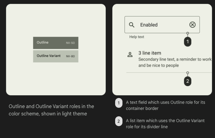 dividers에는 contrast 요구 사항이 다르기 때문에 outlines 색상을 사용하지 마십시오. 대신 outlines varient 색상을 사용하세요.