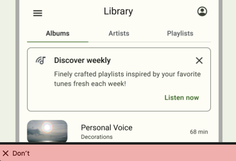 container roles과 마찬가지로 baselines의 fixed color은 비텍스트 대비의 경우 3:1, 텍스트 대비의 경우 4.5:1과 같은 최소 대비 요구 사항을 통과하지 않습니다. 이러한 대비가 필요한 요소에는 적용하지 않아야 합니다.