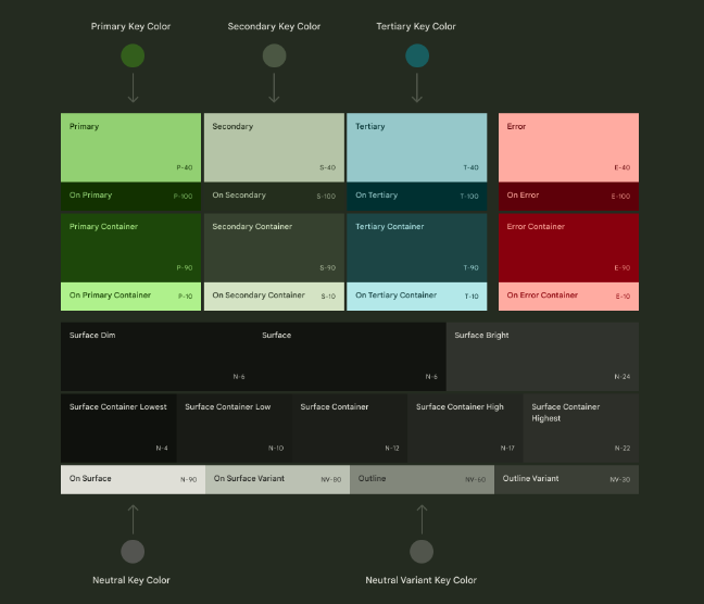 Colors roles 의 톤 페어링은 기본적으로 액세스 가능한 contrast를 제공하고, 추가 사용자 정의 색상이 기존 체계와 조화롭게 작동하도록 톤 조정을 알려줍니다.