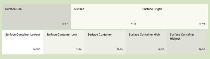 surface container colors 에는 surface roles 에 대한 가장 낮은 강조부터 가장 높은 강조까지의 5가지 색상이 포함됩니다.