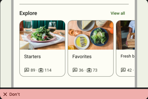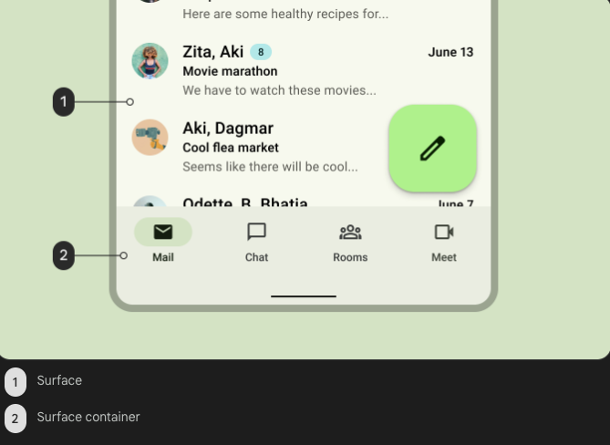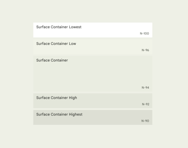 이를 통해 surface에 대해 다소간 대비를 제공하는 표면 컨테이너 색상을 선택하거나 여러 표면 컨테이너 색상을 함께 사용하여 내포된 contained 영역을 만드는 데 유연성이 허용됩니다.