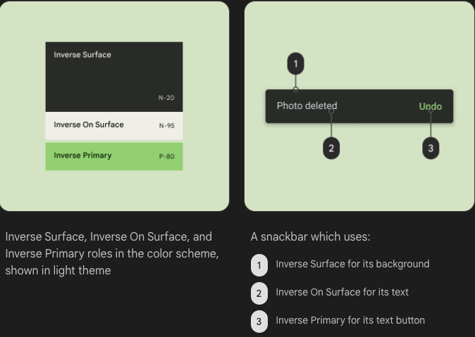 Inverse roles은 구성 요소에 선택적으로 적용되어, 주변 UI의 색상과 반대되는 색상을 구현하여 대비 효과를 만듭니다.