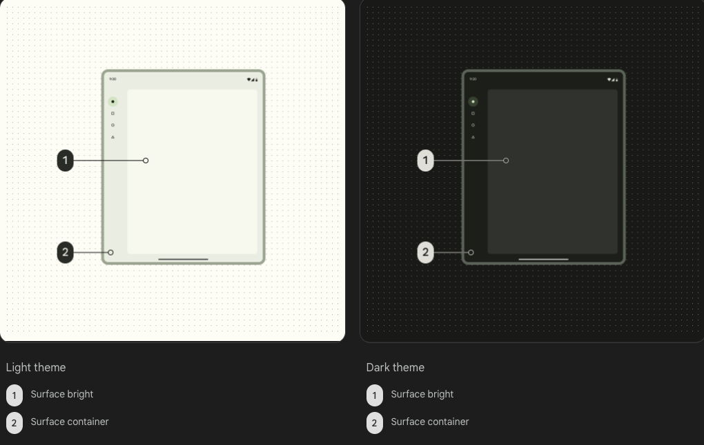 default surface roles을 사용하는 인터페이스에서 매핑된 영역은 밝은 테마에서 가장 밝고 어두운 테마에서 가장 어둡습니다.