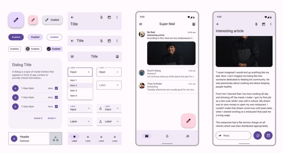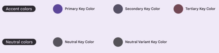 M3 baseline color scheme는 사용자 지정 테마의 색조 관계 논리를 따르는 보라색 기본 색과 보색 강조 색을 사용합니다.