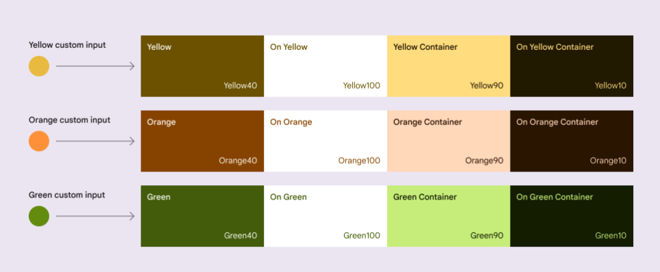 사용자 지정 색상 입력은 톤으로 변환되어 색상 역할에 매핑되는 톤 범위를 자동으로 제공합니다.