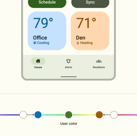 머티리얼은 사용자 정의 색상이 사용자 색상과 짝을 이룰 때 불협화음 색상 체계를 생성하지 않도록 색상 조화를 제공합니다.