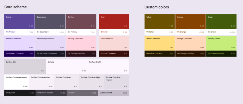 core scheme를 적용할 때, 동일한 원리로 color roles 및 relationships를 사용하여 사용자 지정 색상을 적용합니다.