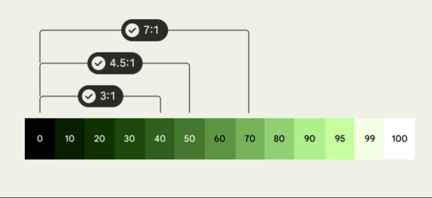 Material의 색상 시스템은 accessible contrast ratios를 충족하는 데 사용할 수 있는 표준 톤 값 및 측정을 제공합니다.