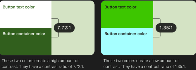 button / button container 와 같은 두 가지 색상 간의 충분한 대비는 광범위한 인간의 시각과 경험에 대한 사용성을 최적화하기 때문에 시각적 접근성의 필수 요소입니다.