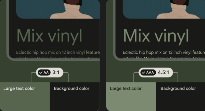 dynamic color은 color contrast에 대한 접근성 표준을 충족하도록 설계되었습니다.