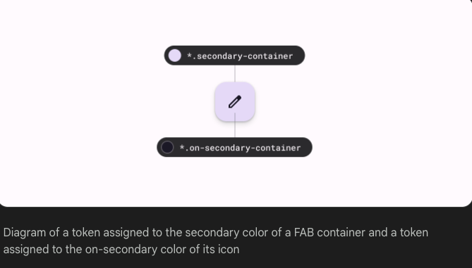 예를 들어 디자이너의 mock-up 과 엔지니어의 implement이 모두 secondary container color,이라는 동일한 토큰을 참조하는 경우 설계 및 엔지니어링은 동일한 색상이 두 위치에서 사용될 것이라고 확신할 수 있습니다.