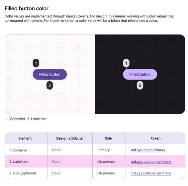다음으로 filled button의 색상 값을 보여주는 표를 찾고, element 아래에 나열된 레이블 텍스트를 찾습니다.