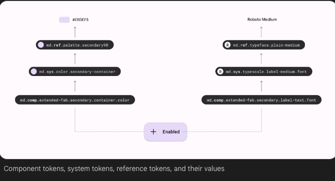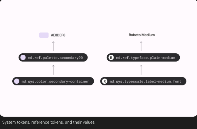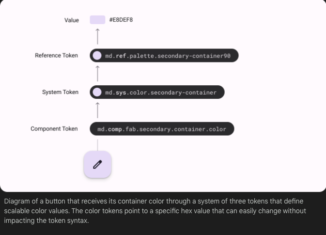 토큰 참조 테이블을 사용하여 색상, 글꼴, 글꼴 크기, 글꼴 두께 등에 대한 Material의 기본값을 조회할 수 있습니다.
