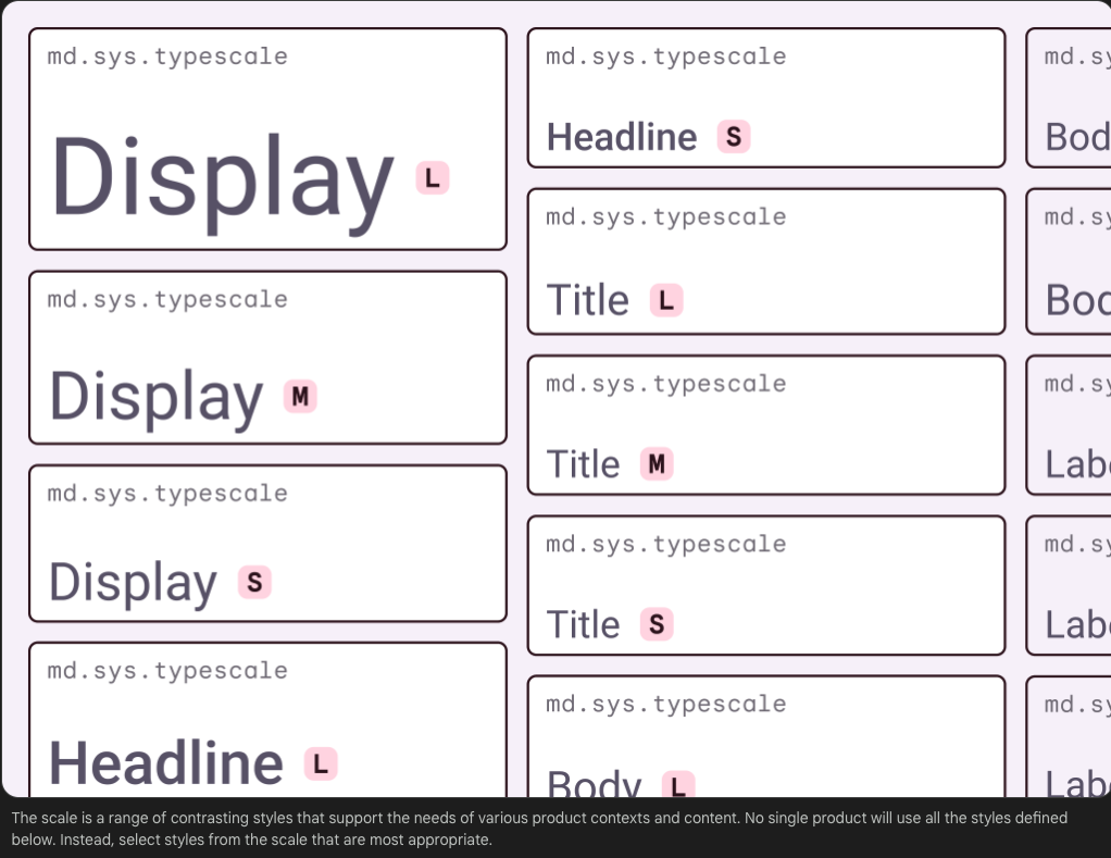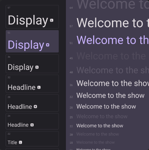 type scale은 앱 전체에서 사용할 수 있는 글꼴 스타일의 선택으로, 다양한 목적을 수용하는 유연하면서도 일관된 스타일을 보장합니다.