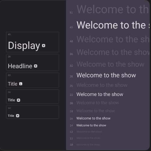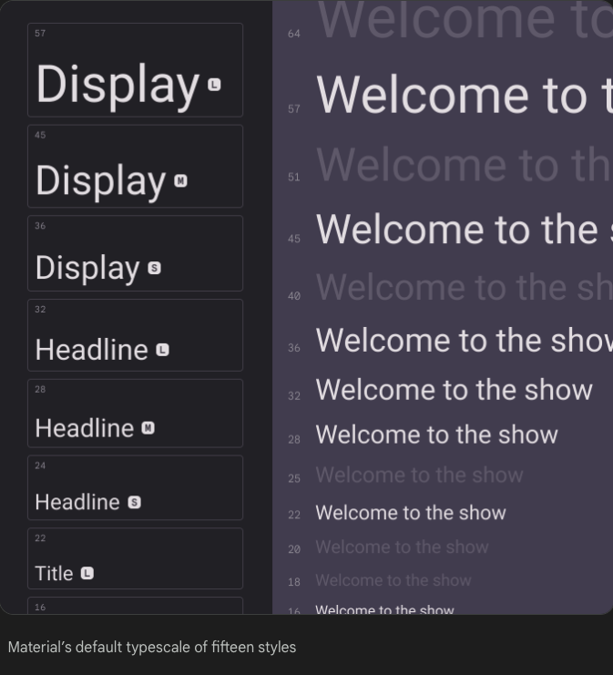 type scale은 앱 전체에서 사용할 수 있는 글꼴 스타일의 선택으로, 다양한 목적을 수용하는 유연하면서도 일관된 스타일을 보장합니다.