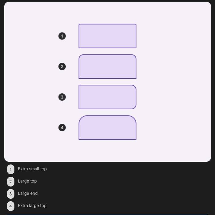 | Extra small top | md.sys.shape.corner.extra-small.top | 4dp,4dp,0dp,0dp, SHAPE_FAMILY_ROUNDED_CORNERS |