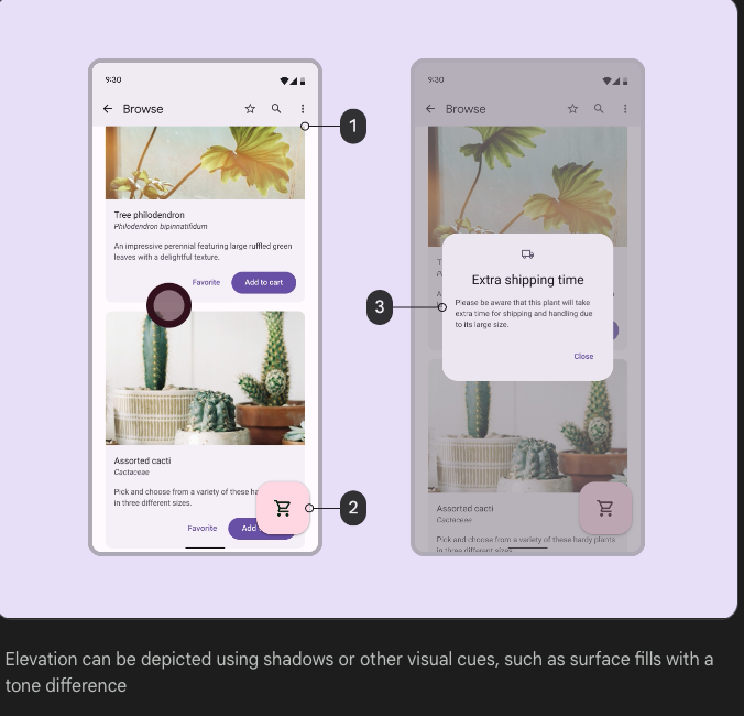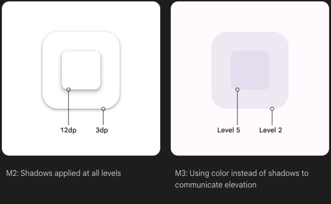 - 배경 색상은 일정하게 유지되지만, surfaces 색상은 elevation에 따라 변경됩니다.
