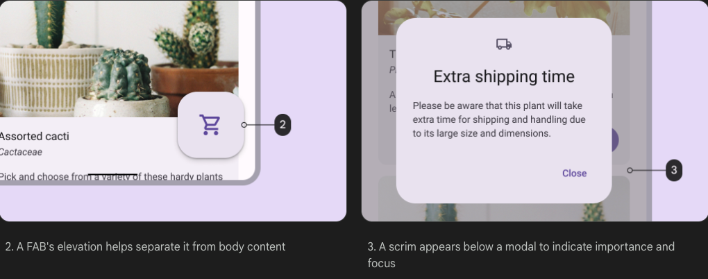 elevation는 그림자 또는 서로 다른 tone 차이가 있는 surface 또는 scrim과 같은 기타 visual cues를 사용하여 묘사할 수 있습니다.