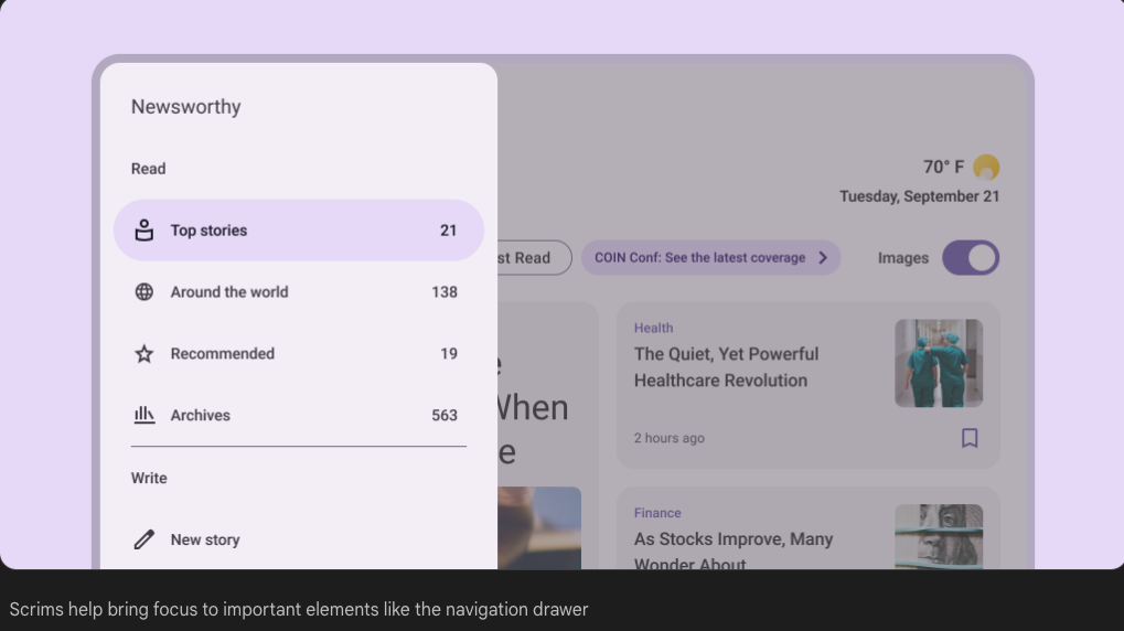 모달 및 확장 탐색 메뉴와 같은 요소 아래에 스크림을 사용하십시오.